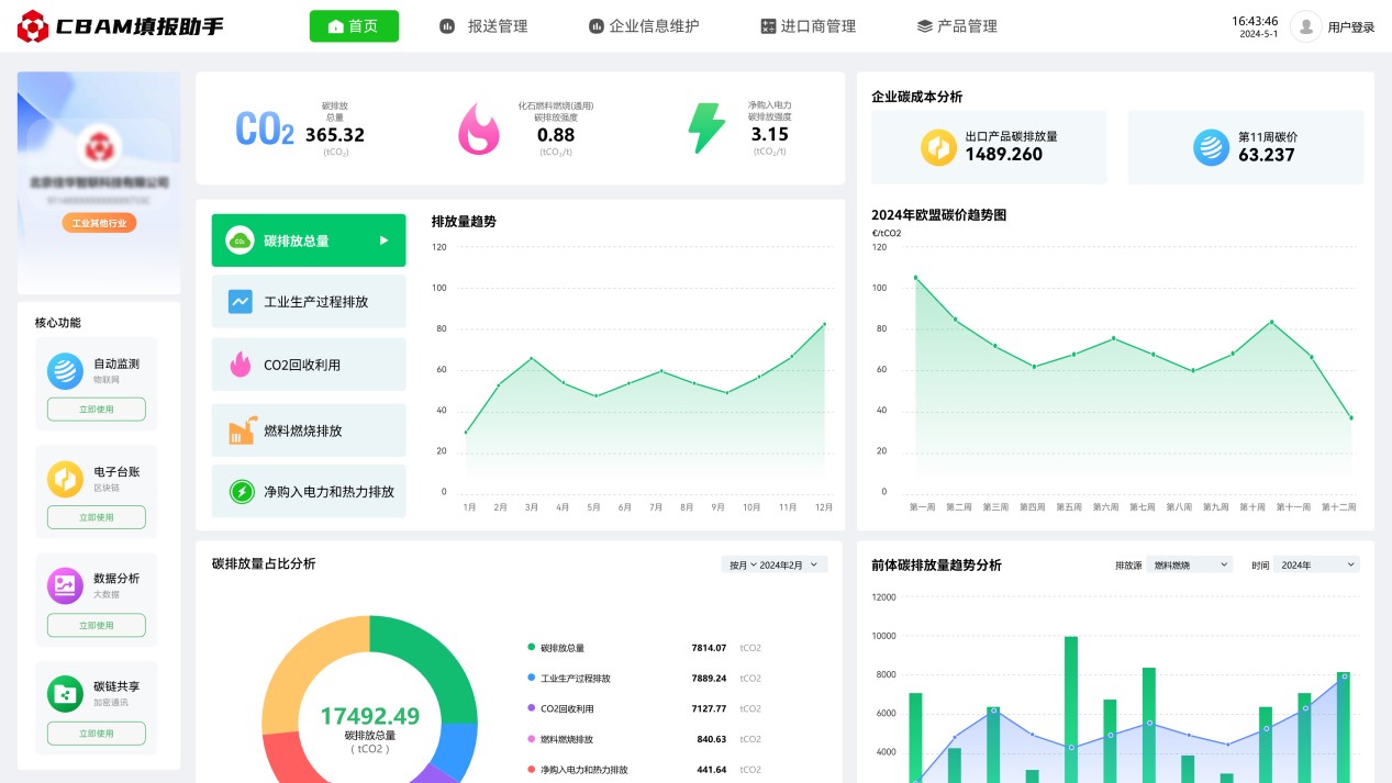 2023年10月1日起,歐盟碳邊境調(diào)整機制(CBAM)已進入過渡期,CBAM涵蓋范圍的出口產(chǎn)品需按時提交產(chǎn)品碳排放報告,未提交報告的企業(yè)將面臨高額處罰。為解決企業(yè)由于官方政策文件理解難度大,專業(yè)門檻高,數(shù)據(jù)搜集難度大,部分?jǐn)?shù)據(jù)缺失無法填等困擾,推出碳關(guān)稅管理平臺(CBAM填報助手),通過數(shù)字化方式,為企業(yè)提供碳數(shù)據(jù)填報、碳數(shù)據(jù)核算、碳數(shù)據(jù)報送、碳數(shù)據(jù)認(rèn)證、咨詢培訓(xùn)等全流程服務(wù)??蓸O大減少企業(yè)碳排放報送門檻,助力企業(yè)低成本合規(guī)報送碳排放數(shù)據(jù)。